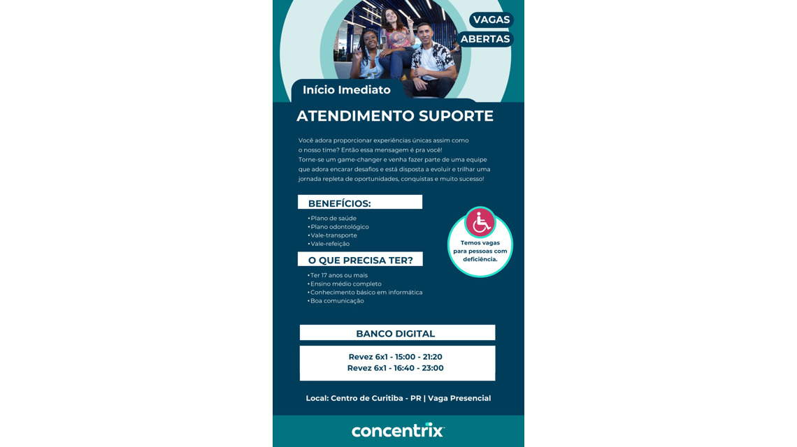 Todas as vagas da Concentrix são elegíveis à Pessoas com Deficiência.